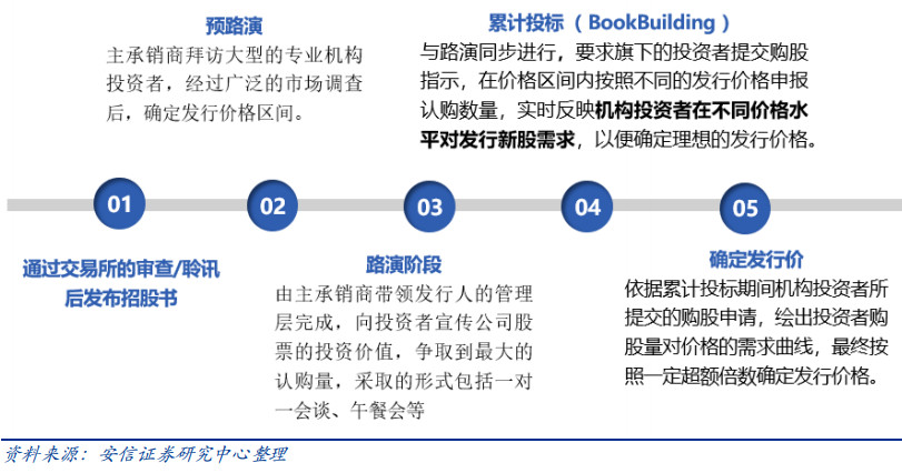 安信证券认为,以美股和港股为例,在通过交易所的审查/聆讯之后到最终确定发行价格之前,公司和主承销商还需要经历预路演、路演、累计投标三个阶段。