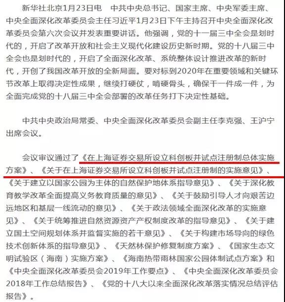 会议指出,在上海证券交易所设立科创板并试点注册制是实施创新驱动发展战略、深化资本市场改革的重要举措。要增强资本市场对科技创新企业的包容性,着力支持关键核心技术创新,提高服务实体经济能力。要稳步试点注册制,统筹推进发行、上市、信息披露、交易、退市等基础制度改革,建立健全以信息披露为中心的股票发行上市制度。